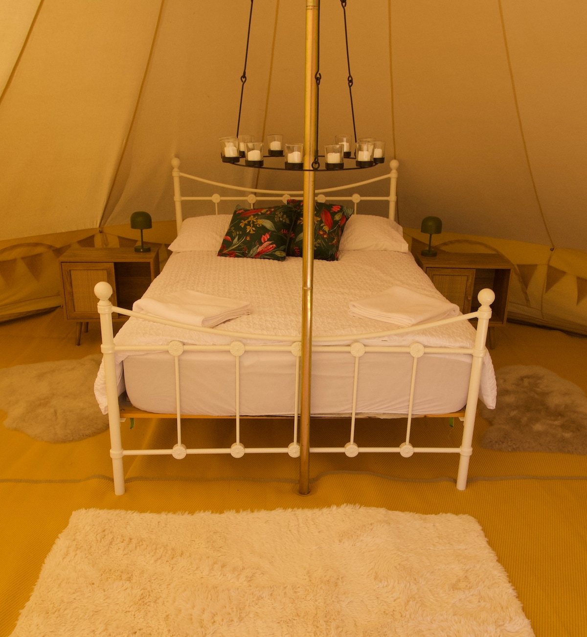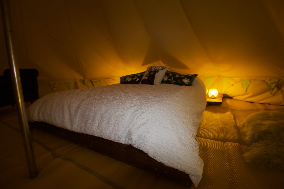 Poppy tent has a proper double bed Mini fridge Electric lights and fairy lights inside it. Single futon Electric charging points Rugs Tea lights Tea coffee sugar Double burner gas stove little pots and pans and stove top kettle. Lovely roll top bath shower attached sink and a composting loo (cleaned when needed) Outside pizza oven Picnic bench Bbq Fire pit Wood charcoal matches provided 🌼🌼Hot tub charged at £30 per stay🌼🌼 paid via air bnb extra services