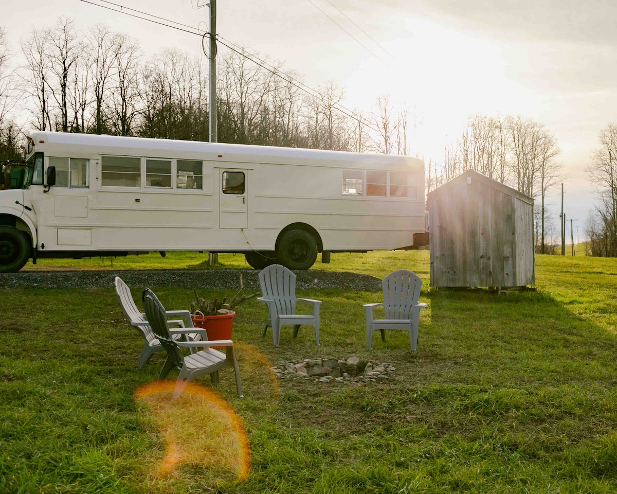 Tucked off a quiet dirt road, this stationary bus promises to provide you and yours an unforgettable accommodation for your next Upstate NY retreat. Come stay in the Sleepy Tire, and wake up to beautiful views of Vermont’s Green Mountains, an indoor bathroom with flushing toilet and hot shower, and WiFi so you can stay connected to those that matter.