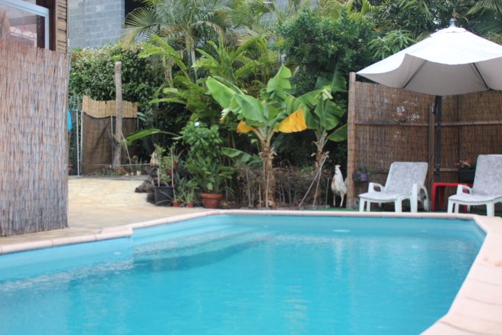 Dans villa 200 m d'altitude avec piscine chauffée : petit bungalow indépendant dans jardin (chambre parentale, lit double, salle d'eau, cuisine ext.). Accès partagé à une terrasse couverte avec une grande table, au jardin et à la piscine. Nous avons dans le jardin deux chiens charmants. Il y a un supplément de 6€ par nuit si vous êtes 2. Des commerces de proximité à moins de 10 min à pied. Saint-Paul centre à 20 min en voiture et plages à 30 min. Transports en commun possibles mais compliqués.