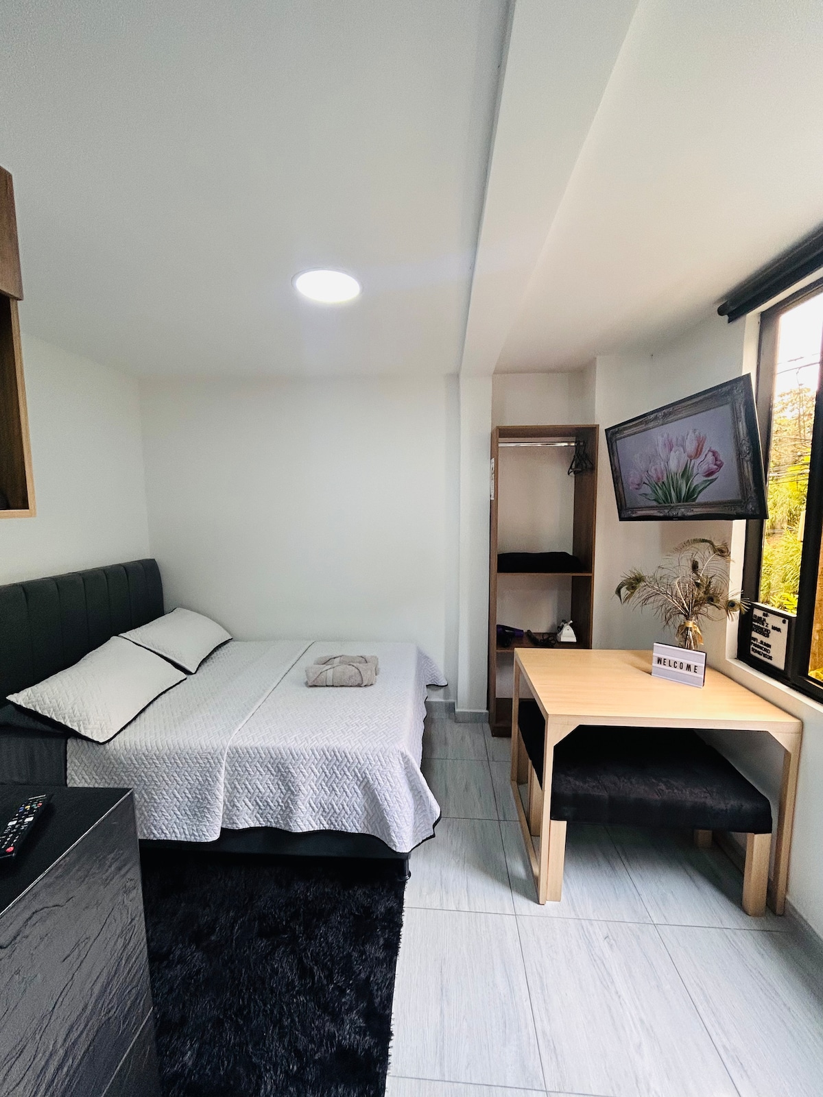 Lujosa suite ,ubicada al frente del aeropuerto y enseguida el centro comercial unicentro, amoblada con todo lo necesario para disfrutar tu estadía, Ac, parqueadero, cocina dotada, agua caliente, Wifi… Con espacio para coworking , con máquina dispensadora de bebidas y alimentos , máquina de café y bebidas calientes y una sala de muy buen espacio para tus reuniones de trabajo