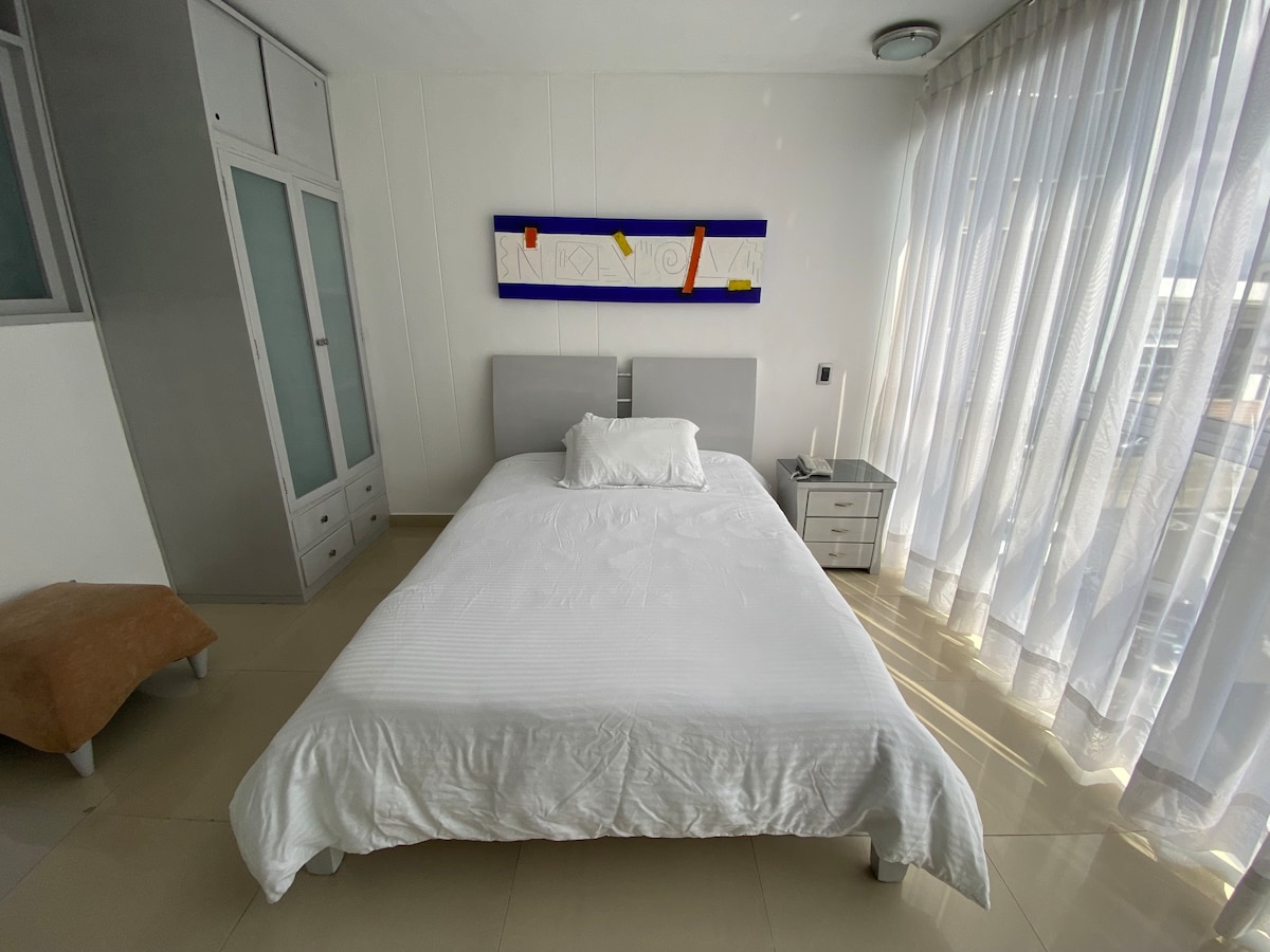 Disfruta de la sencillez de este alojamiento tranquilo y céntrico, ubicado en uno de los mas lindos y seguros barrios de la ciudad, estrategicamente a 8 minutos caminando de la terminal de buses, asi como a distancia caminable de tiendas, droguerias y restaurantes. Ubicado en el segundo piso de una casa y tendrá acceso autonomo mediante cerradura inteligente. El estudio cuenta con una cama Queen , una cocineta basica, baño completo y un amplio y luminoso balcon.