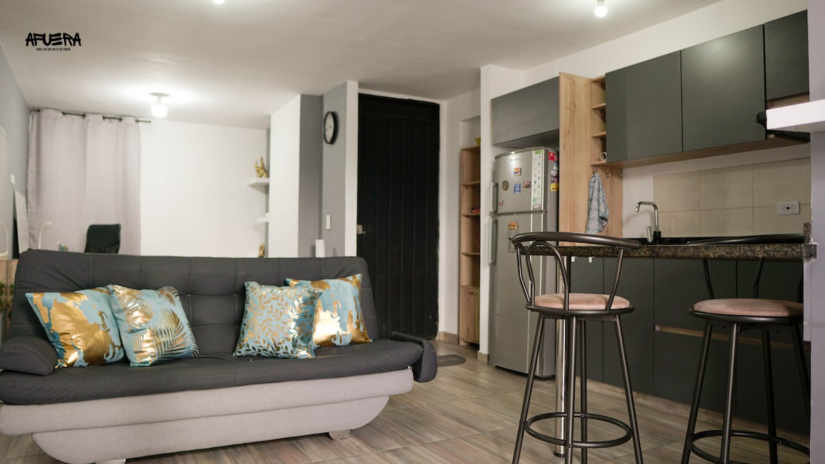 Tranquilo y con una vista única. 📍Estratégicamente ubicado A 5 min del aeropuerto ✈️ 3 min de Expofuturo y el estadio 4 min del C.C. Unicentro 15 min del Parque Ukumari 20 min del centro 30 min de Filandia y Salento Relájate con el sonido de los pájaros y el río. Un apartamento moderno con luces inteligentes en las habitaciones, cocina completamente equipada. Con un espacio especial para que trabajes. Tendrás Netflix, HBO MAX y DISNEY. Vestier en el cuarto principal. Tiene plancha a vapor.