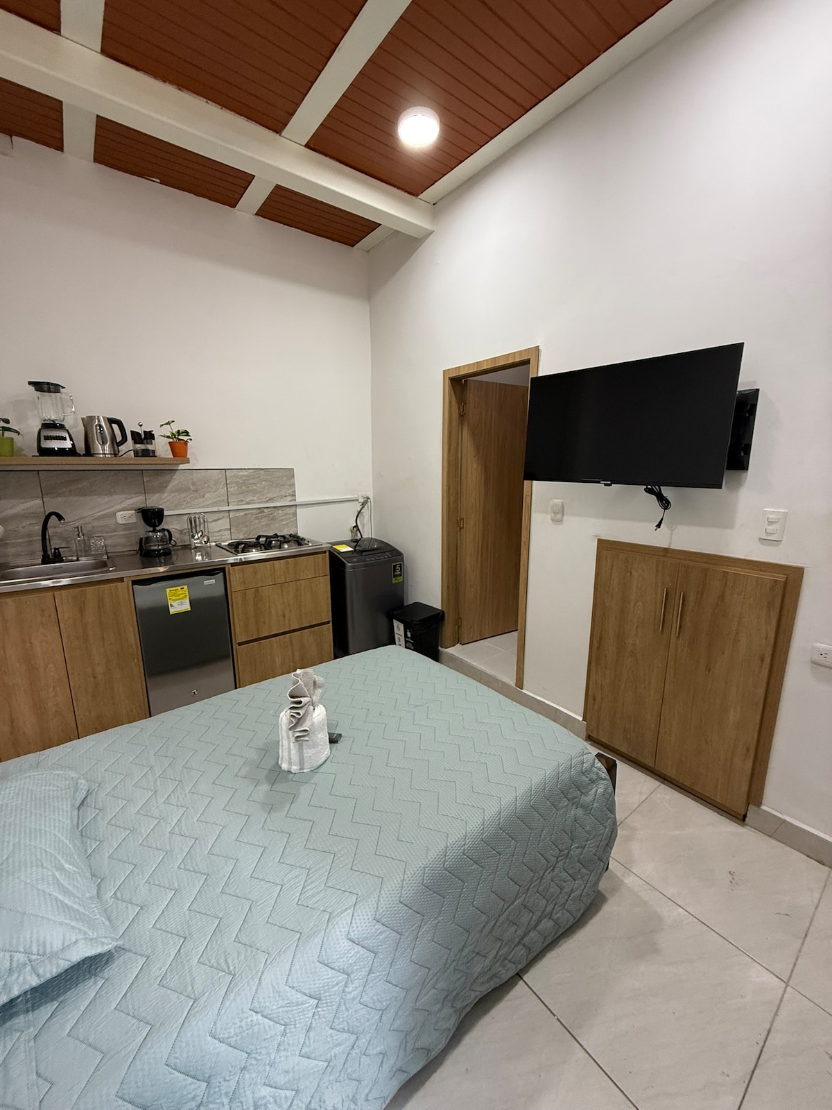Bello, cómodo y cálido aparta estudio ubicado en el centro de Santa Rosa de Cabal. A dos cuadras del parque central y una cuadra de la plaza de mercado. Cuenta con una cama para dos personas y un sofá cama para 2 personas, closet bastante amplio para guardar la ropa, toallas o elementos de aseo. Ducha con agua caliente, nevera, lavadora y estufa. Internet y televisión. El edificio cuenta con ascensor y el aparta estudio está ubicado en el tercer piso.