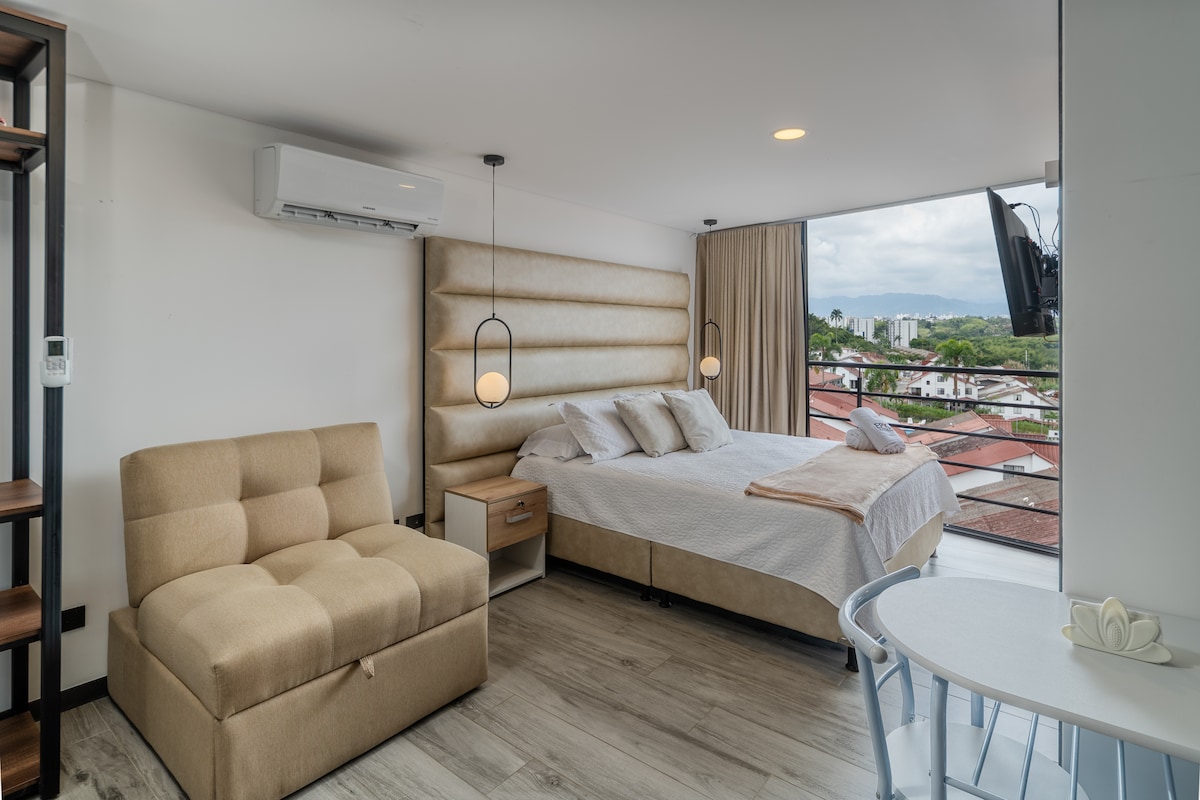 Vive la experiencia de hospedarte en un lugar elegante y contemporáneo en el icónico edificio Plaza U. Este espacio lleno de luz natural es ideal para descansar después de explorar Pereira, equipado con baño privado, cocineta moderna, nevera, cama y excelente conectividad Wifi. Desde aquí, disfruta del paisaje urbano al atardecer mientras aprovechas todas las comodidades del edificio como coworking, terrazas, zona de lavandería y más.