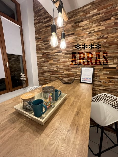 Bonjour 👋🏻 En centre Ville d'ARRAS, à quelques minutes à pied des places et de la Gare venez découvrir notre appartement en RDC dans un petit immeuble de caractère sécurisé et calme, avec cour intérieure. Il vous offrira une cuisine équipée, salon avec tv, un coin repas chaleureux (café et thé à votre disposition), une chambre de 2 personnes, une salle de bain (serviettes fournies, sèche cheveux et machine à laver), wc séparés. wifi fibre, luminotherapie. PS: fêtes et soirées non acceptées