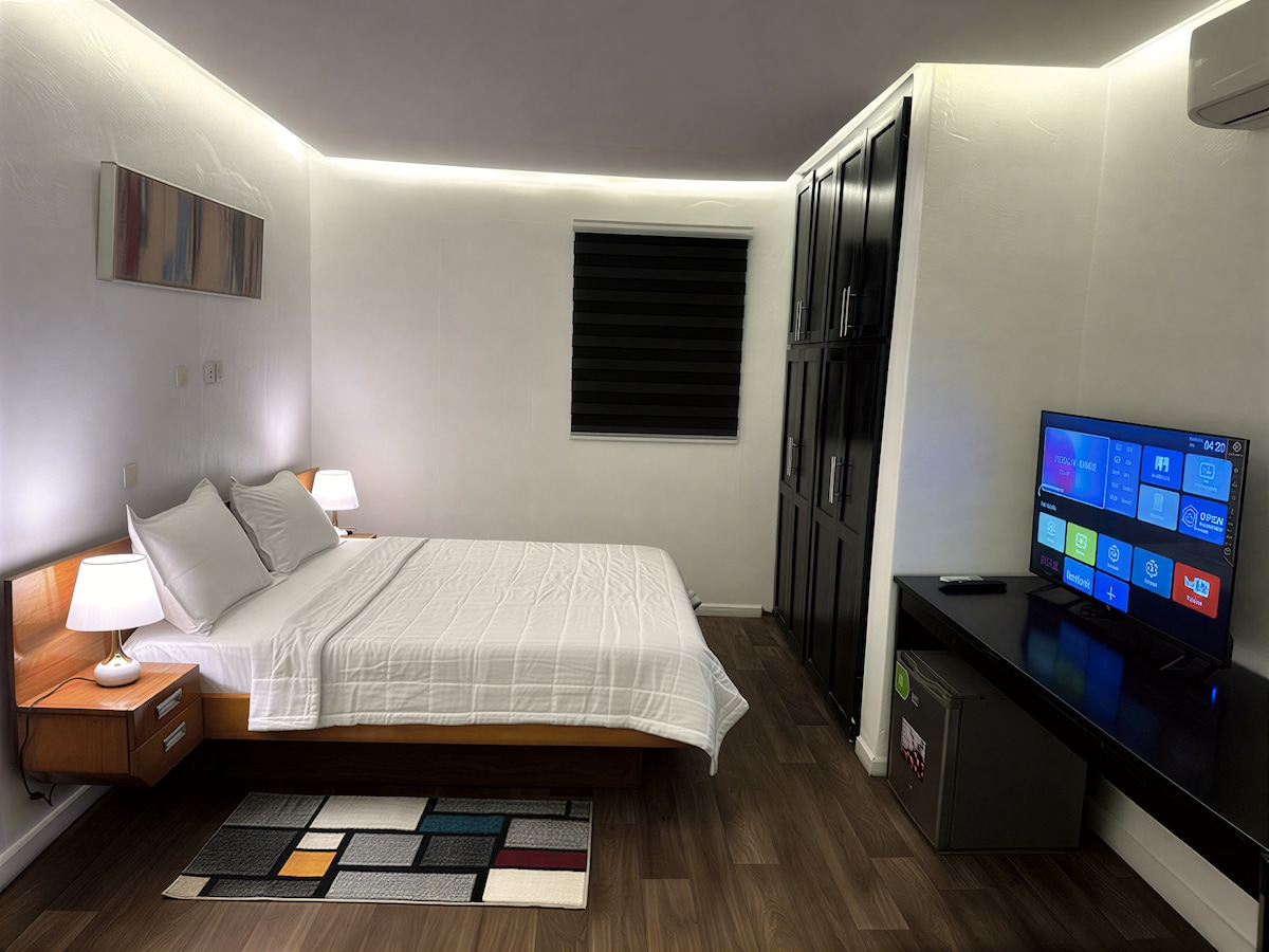 Chambre meublee luxueuse situee au coeur de la capital economique sur Rue Njo-Njo Bonapriso Douala en face de la station d'essence MRS a 2 juste mins de l'hotel la Falaise Bonapriso. Espace unique et memorable pour vos sejours dans un cadre tres propre et reposant. Climatissee - Chauffe-Eaux - Hyper-securisee - TV - Free WIFI- Free Parking nous offrons Pizzas - Boissons - Restaurant - Cuisine - Frigo - Microonde - Salle de sejour pour votre confort. La reception est ouverte 24/7