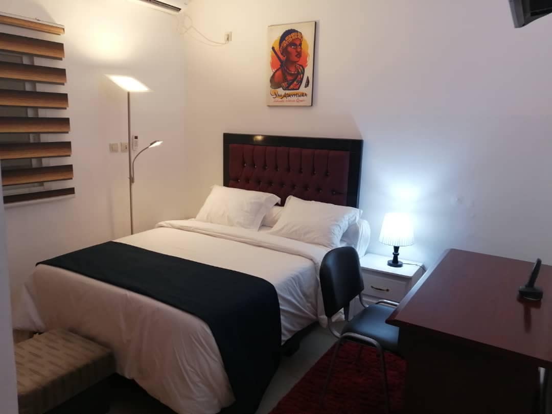 Appartement meublé de deux chambres situé à Makepe, Douala, en bordure de route. Complètement équipé, il est idéal pour les cours et longs séjours. Équipé de deux balcons, internet illimité haut débit (fibre optique), Canal Sat, une Smart TV avec Netflix, Amazone Prime et YouTube intégrés, sécurité 24/7, caméras de surveillance dans l’immeuble, parking gratuit, ballon d’eau chaude, machine à laver, cuisine équipée, climatiseurs dans toutes les pièces, deux ventilateurs, groupe électrogène.