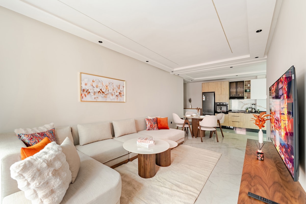 Bienvenue à Marrakech ! Plongez dans le confort de ce superbe appartement contemporain, idéalement situé en plein centre-ville. Spacieux et baigné de lumière, il offre deux chambres avec balcon privé et coffre-fort, un salon élégant avec TV connectée (Netflix inclus), une salle à manger moderne, et une cuisine entièrement équipée (machine à café, lave-vaisselle, frigo américain, lave-linge…). Climatisation centralisée, Wi-Fi haut débit et résidence sécurisée 24h/24