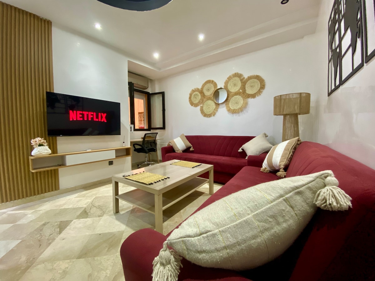 Appréciez le confort de ce magnifique appartement, au cœur de Marrakech dans le quartier de l’hivernage. Design, confort et ultra fonctionnel, avec en plus une piscine sur le toit, pour une expérience unique loin de votre quotidien. Cette perle d’appartement est l’endroit calme et agréable parfait pour vos vacances au cœur de Marrakech. Internet Fibre Optique 100 Mega A LOUER LES YEUX FERMÉS. NB: couple marocain ou mixte , devront présenter UN ACTE DE MARIAGE A LEUR ARRIVÉE