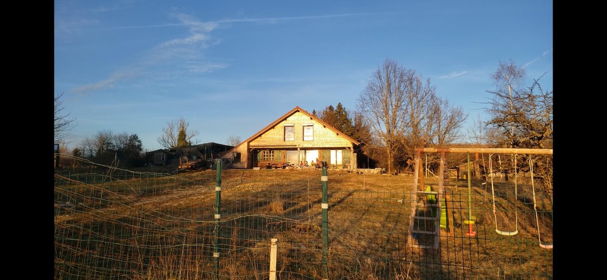 Chalet chaleureux sur les hauteurs du Jura, baigné de lumière et entouré de verdure. Plus qu’un simple Airbnb, c’est notre maison principale, vivante. Attendez-vous à croiser deux chats en liberté et quelques poules (100% autonomes). Nous accueillons des voyageurs responsables en quête d’authenticité. Profitez des sentiers, lacs et forêts alentours, et du confort d’un intérieur boisé. Le logement est idéal pour 4 personnes mais 2 lits d’appoint peuvent être déployés portant à 8 convives.