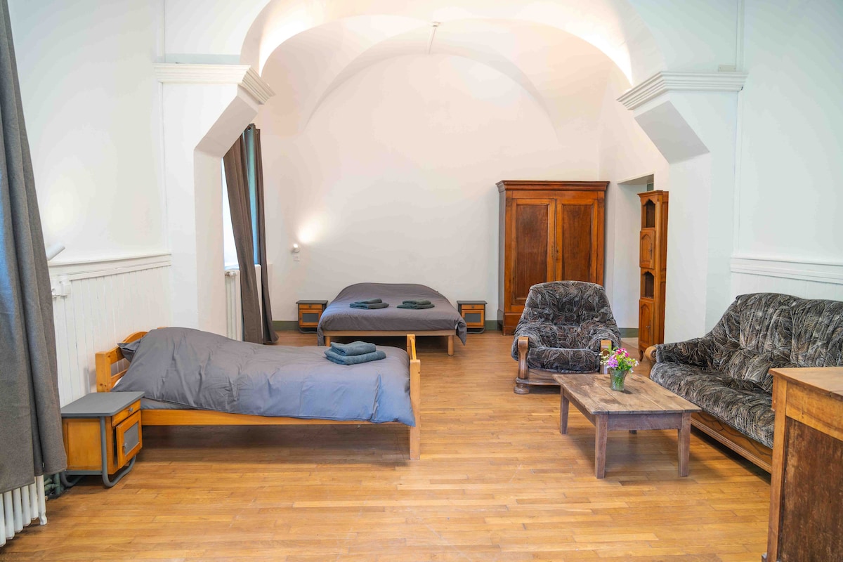 Un séjour unique entre nature, culture et patrimoine. Niché au fond d’une vallée protégée, notre hôtel installé dans l’ancien monastère du Val de Consolation vous accueille pour une expérience unique de ressourcement, de calme et d’émerveillement. Soyez les bienvenus dans la chambre 101. Située au 1er étage, avec vue sur les jardins. 2 chambres, avec Salle de bain (douche+WC), drap et serviette inclus, frigo, table et bouilloire electrique.