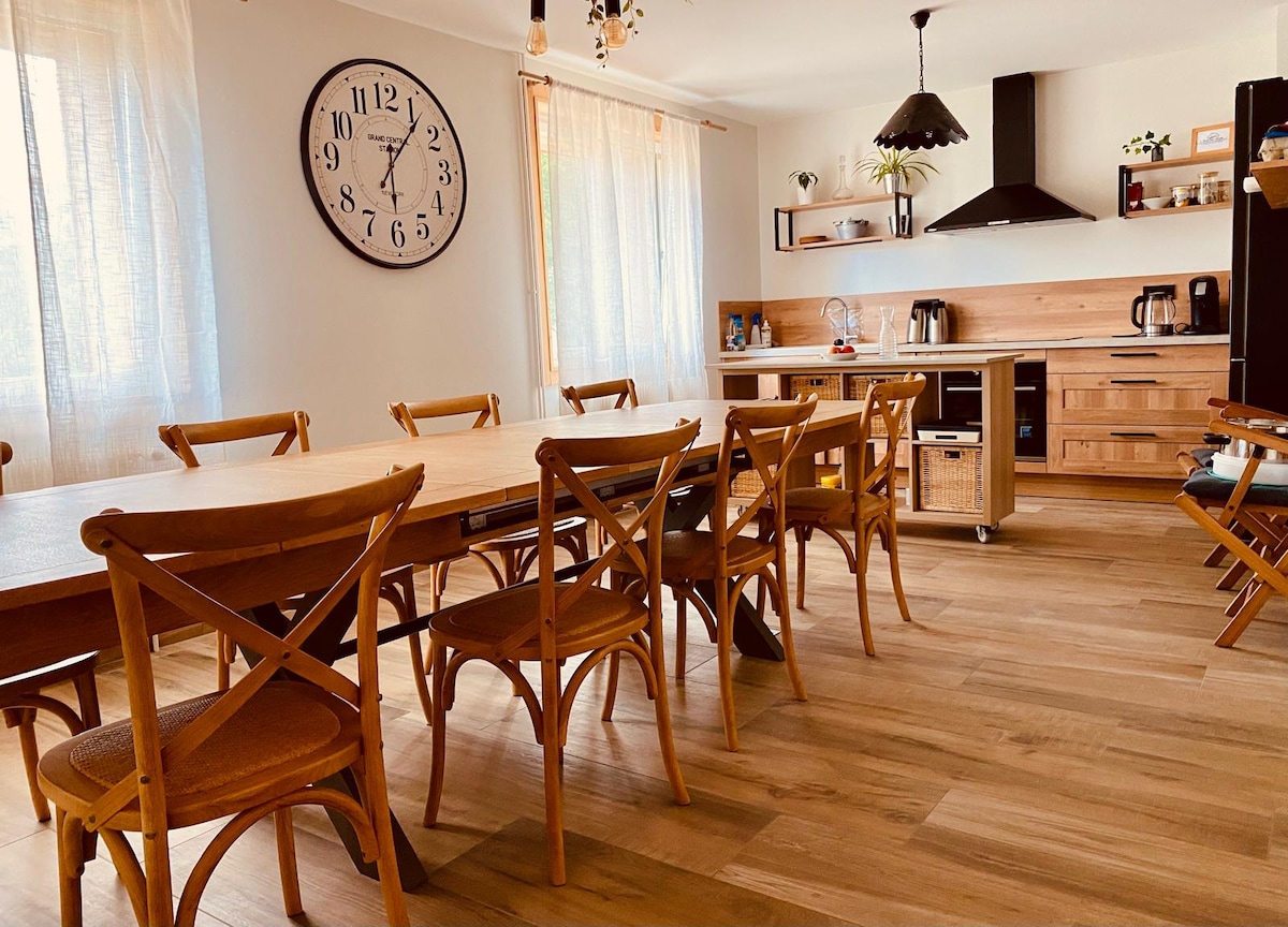 Maison rénovée avec goût, très spacieuse, alliant le confort moderne et une ambiance campagnarde. Fraiche pendant l'été, avec les lacs et les rivières pour les baignades, les chemins et les routes forestières pour les balades à pied ou en vélo. Chaleureuse l'hiver avec un chauffage central et un beau poêle à bois pour l'ambiance, le ski de fond à 200 m, pistes de descente à 10km. Saint-Laurent en Grandvaux à 2km pour les commerces. Attention: draps et serviettes en option. Me contacter