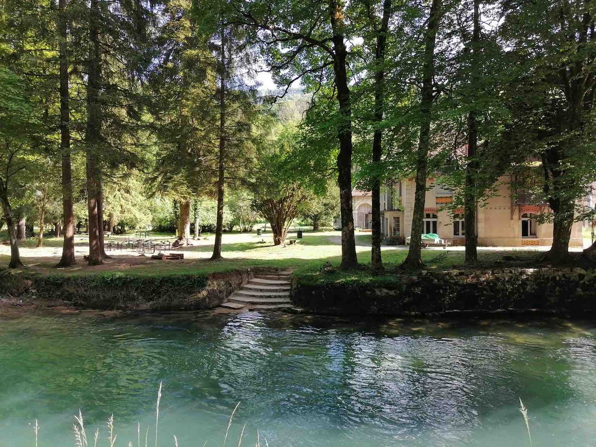 Private, family owned castle in the east of France, built in the 16th century. Come and spend your day swimming and kayaking into the river running through the beautiful garden. Perfect-size home with 8 rooms, 20 beds, it can sleep up to 25 people. 2 floors : first floor includes kitchen, dining room, living room, 2 bedrooms and one bathroom. Second floor includes 6 bedrooms and 2 bedrooms. 5 km away is Ornans, a typical village “à la française”, offering boutiques, restaurants and groceries.