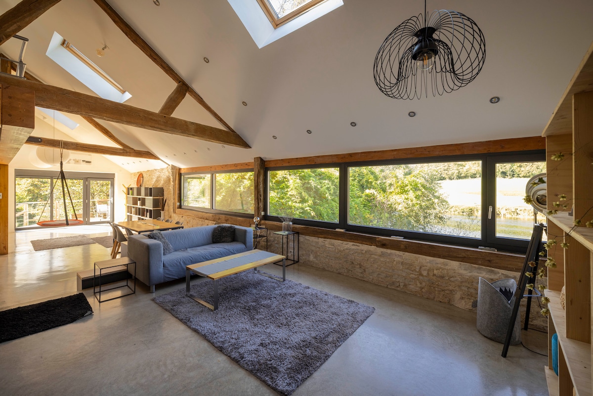 Venez passer un moment reposant en famille ou entre amis en bord de Saône. Par un escalier vous accédez à une terrasse face à la Saône puis entrez dans la maison pour découvrir l’intérieur : Une entrée, un grand salon et sa mezzanine bibliothèque, une salle à manger, une cuisine équipée d’un piano de cuisson, 2 salles de bain ainsi que 3 chambres. Au-dessus des anciens fours de la tuilerie se trouve une annexe composée de deux chambres et une salle de bain. Un grand jardin arboré et ses oiseaux.