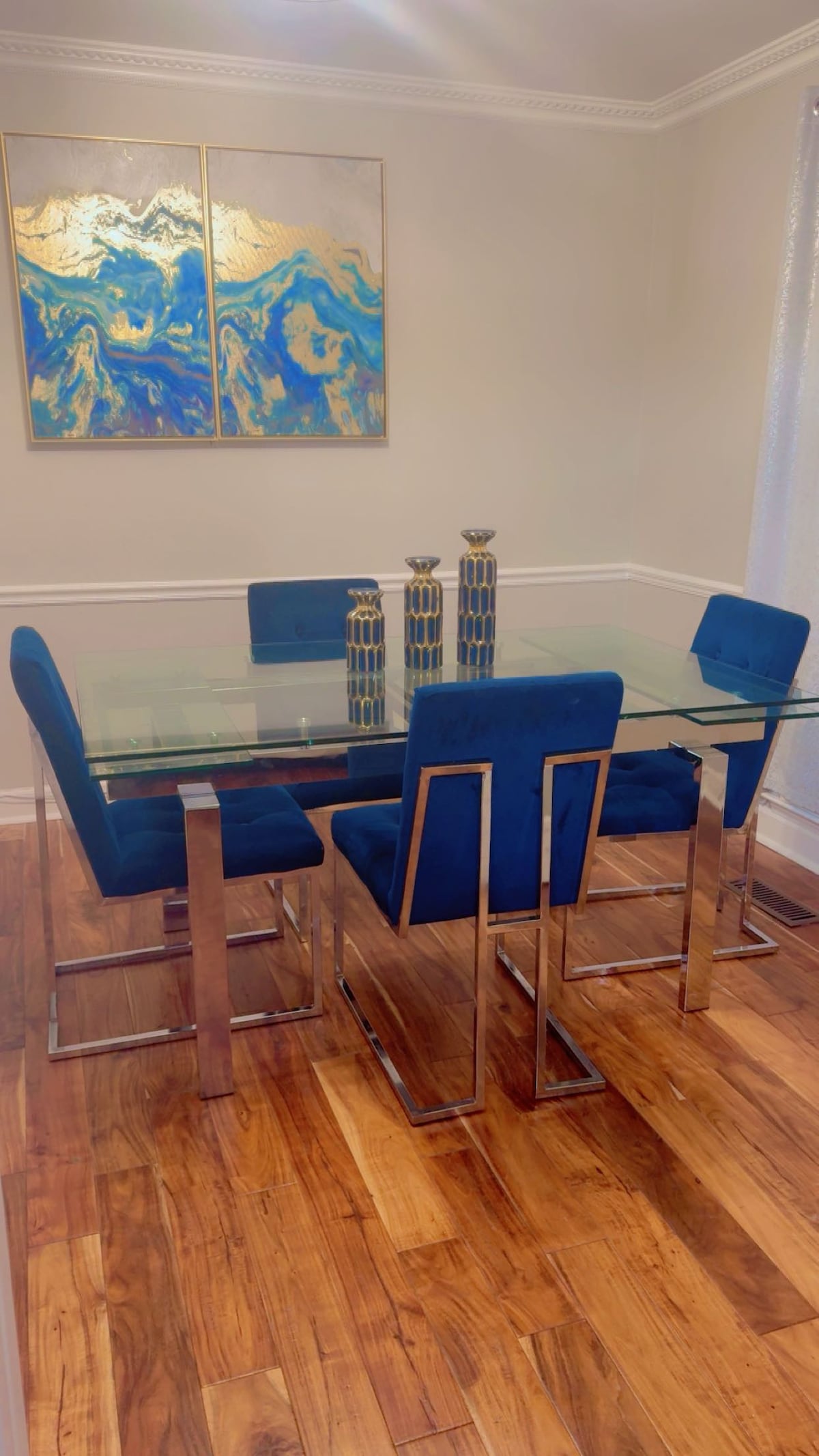 Big spacious, beautiful two-story home in a quiet setting. Modern kitchen refrigerator, stove/oven, dishwasher, coffee maker, toaster, microwave, pots and pans, flatware, and silverware. (All TVs streaming only) Living Room: 55in TV, Family Room: Big and spacious with two 65-in TVs and a bar (you stock). Electric Fireplace Dining/Sitting room: Dining tables with 6 chairs. Central air/heat with 2 zone controls for up & downstairs. WiFi internet is available throughout all rooms and common areas.