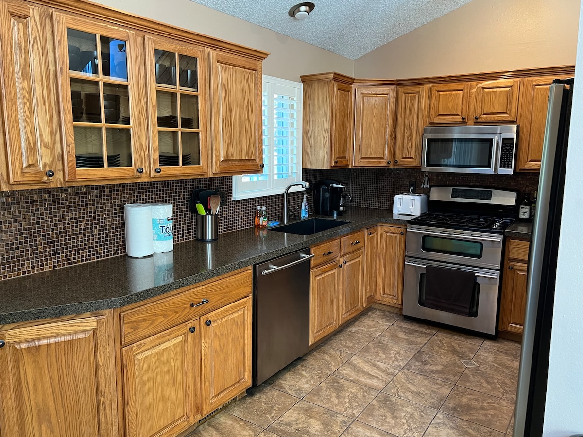 Our downstairs apartment with a private entrance offers all the comforts of home in a newly remodeled and fully furnished space. Relax on the recliner sofas and watch a movie, or get some work done with scenic views of the open space and mountains. Sleep comfortably on our memory foam mattresses and wake up to a variety of hot drink options at the coffee bar or cook a meal in the fully-equipped kitchen. Within minutes of parks, trails, outlet shopping, dining, & Castle Rock Adventist Hospital.