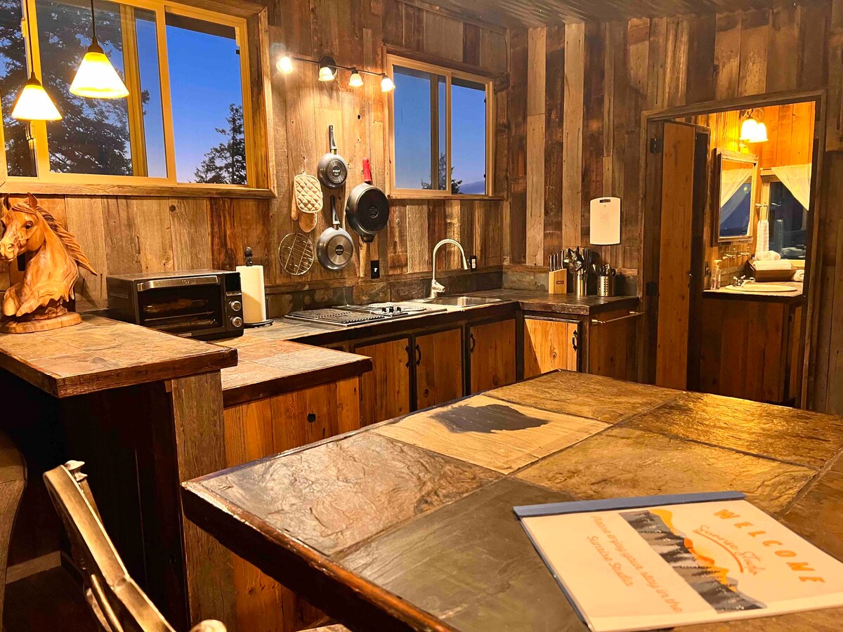 Enjoy amazing sunrise and moonrise views. At the Sunrise Studio you will soundly sleep on a cozy queen bed. Also offer a single couch & air mattress for extra sleep. Full bathroom with sink, toilet and shower. Kitchen includes cooktop grill/griddle, sink, air fryer, toaster/convection oven microwave, coffee maker and refrigerator. Full Laundry with washer & dryer. Studio is heated by electric heat or a wood stove and cooled with AC. There is also a small outdoor space with a fire pit. Enjoy!