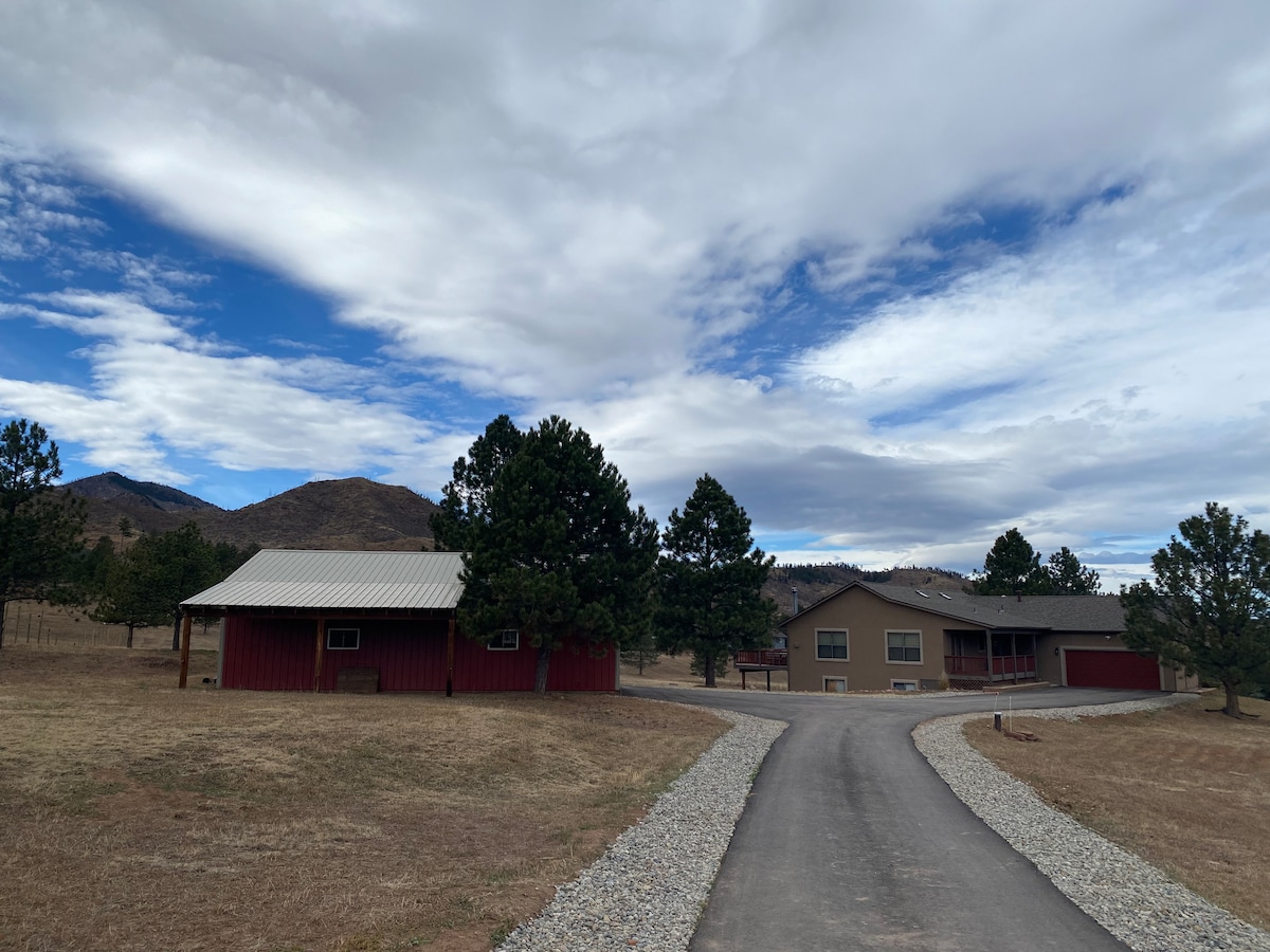 Southwest Art Deco Design with country landscape. 15 minutes to downtown Castle Rock. An ideal setting for entertaining your family and friends. Located on beautiful 5 country acres, an animal lover's paradise. After a long day of events, take a nice soak in the hot tub and visit the Goat family onsite. Golf courses, antique shops, restaurants and hiking trails all within a short distance for you to explore! Neighborhood park is just a couple-minute walk for kids to enjoy!
