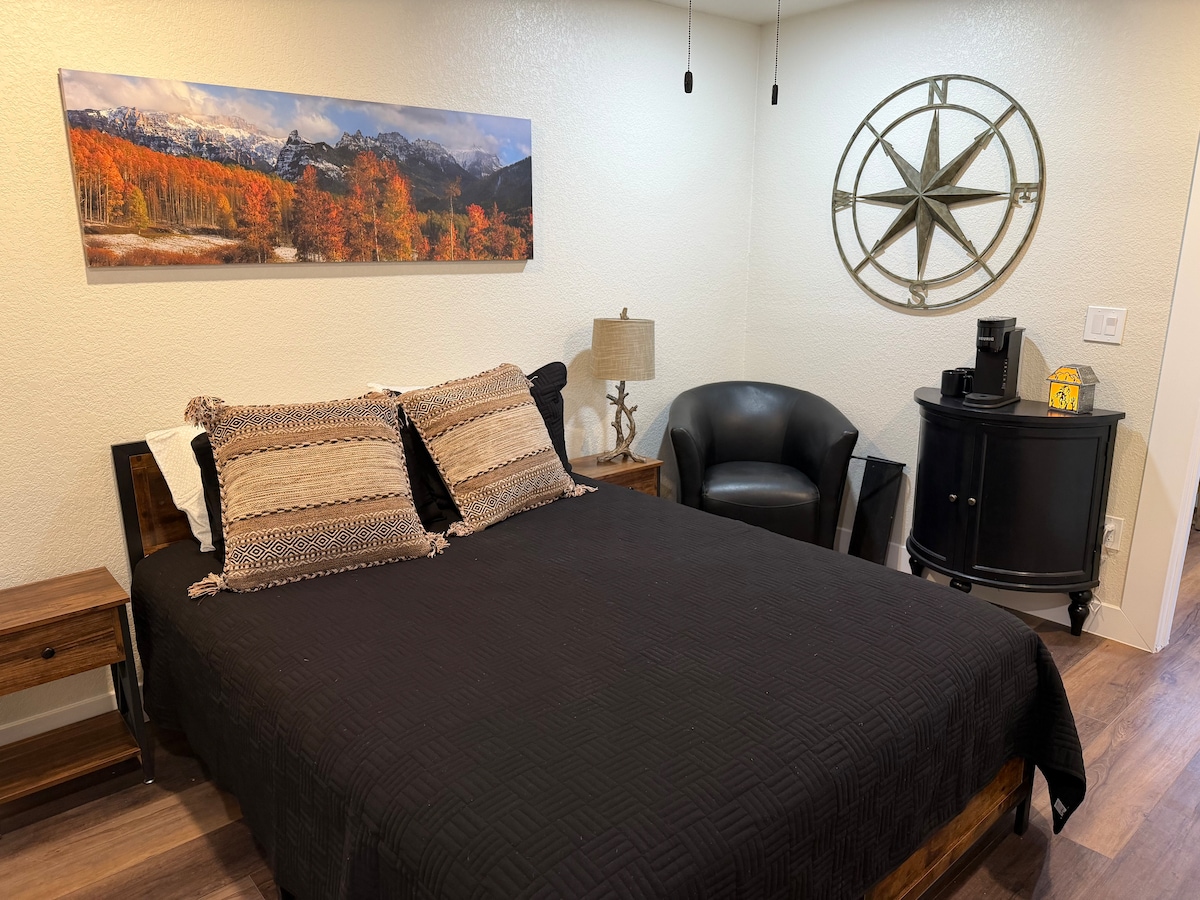 One bedroom 1 bath basement. Has a great bath, with large walk in shower, and heated tile floor.Free WiFi, netflix, amazon prime hulu,, and sling tv. Use of hot tub, grill and great outdoor lounging space, with hammock under the tree. Free water and coffee. Hair and body products are included. Also has fold out sofa bed. Smoking allowed in all outdoor areas. 420 friendly. adventure awaits with paddle boards, golf clubs and mountain bikes available, for a small add on.