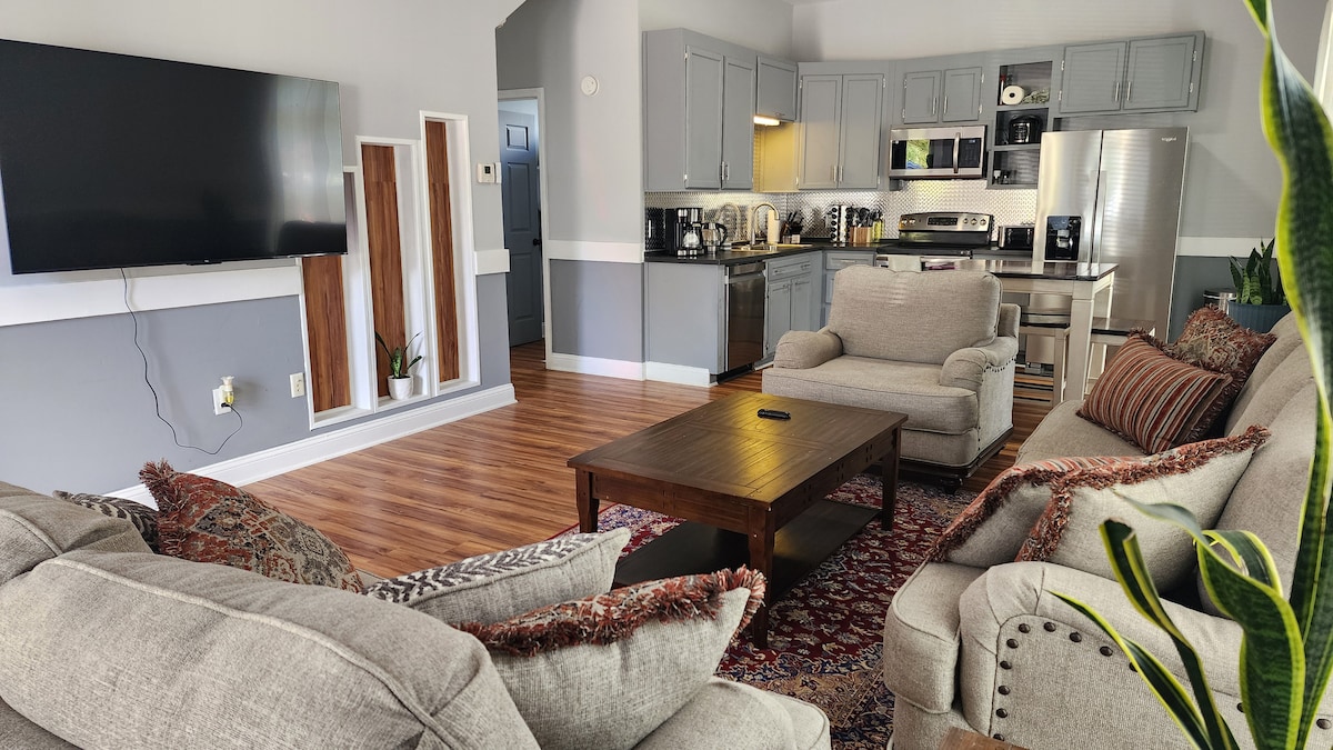 Newly launched, be among our first guests. Enjoy intro pricing on a private apartment attached to a larger home w/ two king bedroom suites, cozy living spaces, and peaceful outdoor patio. Our Atlanta Suite has its own private entrance and offers privacy while remaining part of a peaceful, wooded property. Perfect for couples, creatives and quiet getaways. Fully equipped kitchen. Laundry Room with comp. detergent. Bathroom stocked with essentials. Outdoor patio seating for morning coffee.