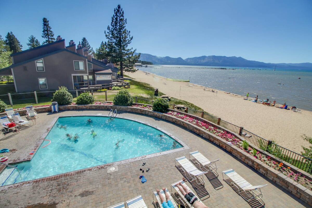 Cozy Tahoe getaway in the center of town with private lakefront beach access! Just 5 minutes from Heavenly ski resort. Step out your door and enjoy the great restaurants, shops and attractions in South Lake Tahoe. Gas Fireplace, fully equipped kitchen & bath, WiFi, cable, and coffee provided. King bed with Queen sized sofa pull out bed in family room. Washer and dryer in building. Private balcony. Indoor parking, 2 seasonal outdoor pools + Hot Tub. #011774
