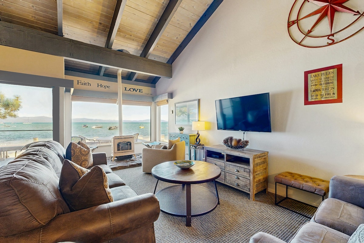 This beautifully renovated lakefront condo features breathtaking views, modern amenities, and is nestled in a quiet gated community with a private beach steps from your door. This gorgeous property is perfect for a beach vacation, family ski trip, or intimate couples' getaway in the mountain paradise of Lake Tahoe. The home includes three bedrooms, three full bathrooms, a newly remodeled kitchen, two gas-burning fireplaces for relaxing nights, and two sunny balconies with magnificent views.