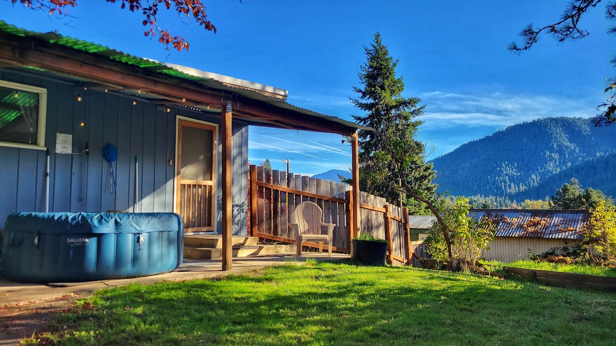 Kick back and relax at this peaceful 2 bedroom on a hill in uptown Oakridge. Your side of this duplex features on site parking, 2 bedrooms, a fenced backyard, full washer and dryer, and a private hot tub on your back porch. The property is within walking distance of 3 Legged Crane Brewery (the pub), Morning Light Coffee, the Corner Bar, the post office, and the library. Great for a bike trip, hiking, frisbee golf, a visit to Willamette Pass, or Crater Lake! Free Parking on site!