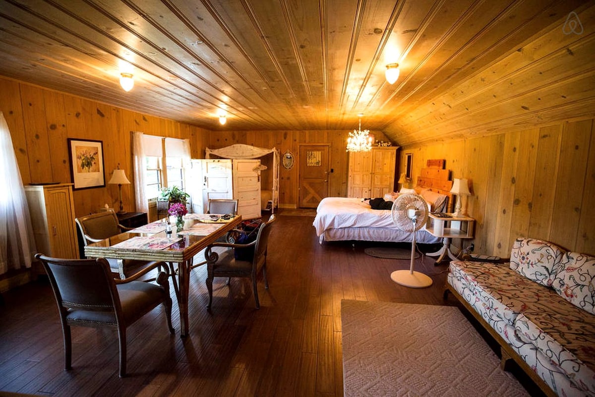 The cottage is a cozy suite for two for a romantic getaway or a quiet night in the country. The property has a large lawn area with picnic tables and firepit for watching the stars and cooking s'mores. Our Cottage is the perfect size for two. It features a king size bed and two swivel chairs for relaxing as well a table for eating or working. The kitchenette has a microwave, sink, and mini-refrigerator, as well as a Keurig Coffee maker, toaster and dishes for two. There is also a bbq supplied.