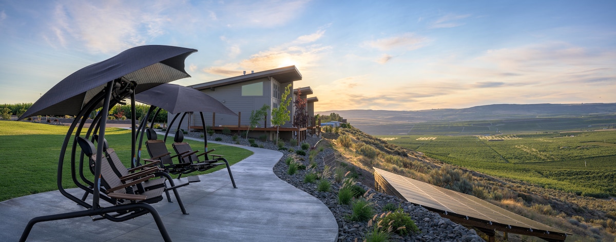 Escape to our private cottages, blending contemporary design & comfort against the stunning Columbia River valley. Each cottage features a cozy living space with a gas fireplace & sofa sleeper + a serene king suite with blackout blinds for deep sleep. The well-equipped kitchenette makes meals easy. Your stay is perfected by a spacious private deck, offering a spectacular 180-degree valley view. Enjoy the shared BBQ gazebo & expansive lawn for outdoor dining & fun. Your vineyard vacation awaits.