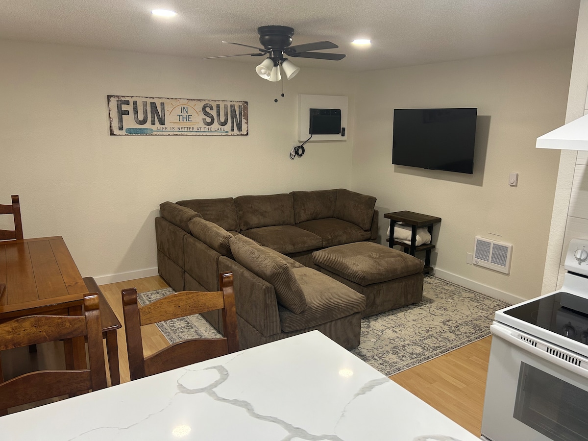 Two story unit, no one above you! Enjoy a relaxing stay in a town home only 2 miles from downtown, and right next to the beautiful Lakeside Park. Centrally located to vineyards, golf, fun at the lake, fishing, water sports, hiking, window shopping, and more! Free COVERED parking for 1 car, additional parking for a second car, WiFi, a pool, sauna, full kitchen, private patio, BBQ, and quick walk to the lake! Perfect for a couple's weekend, a small group, or small family getaway for 1-6 guests.