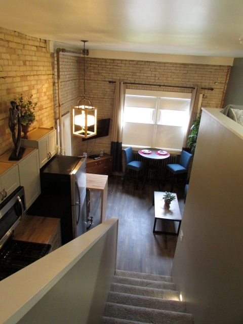 This glamorous urban one bedroom is a main level unit and features an open floor plan in the living room and kitchen, with exposed brick walls, and 14 foot ceilings and the unit is decorated in a modern Athens style. It is conveniently located in the City Center of Superior WI, and walking distance to the downtown, activities, restaurants, and shops.