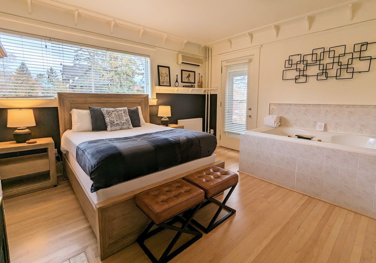 The Veranda Suite of the GG Barnum Mansion is located on the second level, this beautifully moody room with dark walls and an oversized leather chair that makes you want to spend your time in Duluth indoors. This suite boasts a Samsung Frame SmartTV that displays beautiful works of art, a jetted bathtub and separate shower. This property is intended for adult getaways, no persons under the age of 16 are permitted.