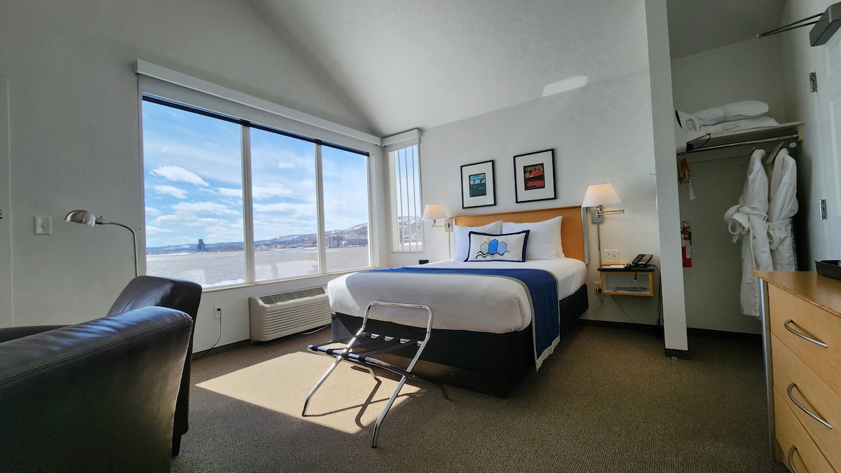 Enjoy our well-appointed neighborhood-view Balcony Guest Room. Second floor room with stair access only. These rooms feature a queen bed, pullout twin sofa sleeper, private balcony, desk, and 43" smart TV with premium cable channels. Bathroom with shower/tub combination. Complimentary continental breakfast in our lobby each morning. These rooms do not have a water view.