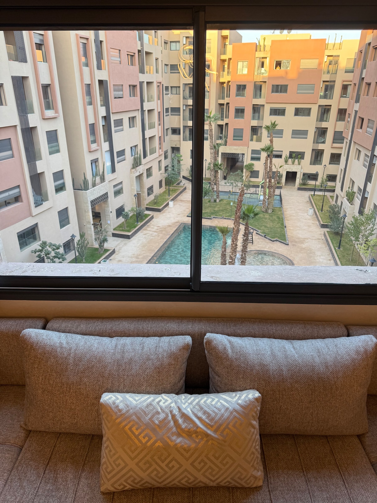 Niché au cœur du prestigieux domaine touristique Marrakech Golf City, découvrez ce luxueux appartement offrant une vue exceptionnelle sur le golf, la piscine et sur les majestueuses montagnes de l'Atlas. L'appartement a été décoré avec amour avec un style moderne, bohème et beldi-chic. Il est entièrement équipé et offre des prestations haut de gamme La résidence est orientée vers les montagnes de l'atlas, elle est très prisé de part son cadre calme et sécurisé et de sa proximité du centre ville