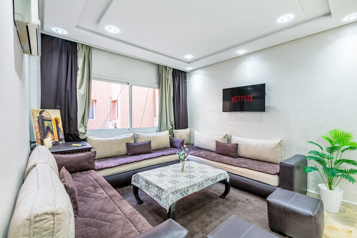 Appartement moderne et chaleureux de 72 m² avec terrasse et piscine idéalement située en plein coeur de Marrakech, dans le centre de Guéliz. À 10 mn à pied du centre commercial Carré Eden et à 15 mn en taxi de l'aéroport. Le magnifique jardin de Majorelle et Musée d'Yves St Laurent se trouvent à 10 mn à pied. Une piscine sur le toit est accessible uniquement aux résidents de l'immeuble. C’est un appartement indépendant, privatif et tout équipé avec Netflix HD/IPTV et FIBRE OPTIQUE 100mb/s