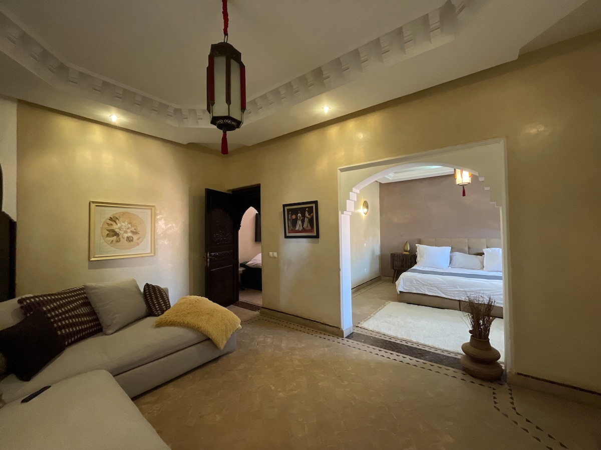 Découvrez notre ravissant Riad EXCLUSIF, conçue comme un petit «chez soi», idéalement situé au cœur de la médina de Marrakech. Ce havre de paix allie authenticité et confort, offrant un refuge tranquille à quelques pas des souks animés, des attractions culturelles et accessible en voiture. Profitez d’une expérience authentique et reposante dans un cadre raffiné où chaque détail est pensé pour votre bien-être. Nous avons hâte de vous accueillir et de rendre votre séjour inoubliable
