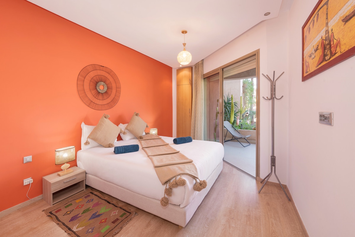 A sunny haven in the heart of the Palmeraie 🌴 Bright 82 m² top-floor apartment with 2 bedrooms (one with king-size bed), fully equipped kitchen, living room, walk-in shower, and 3 large terraces with open views. In a gated, secure residence with 2 large pools, water features, and lush gardens spread over several hectares. 10-minute walk shops, restaurants, cafés, and a pharmacy. Perfect for couples, families, or friends seeking peace, greenery, and quick access to the city center (15 min away)