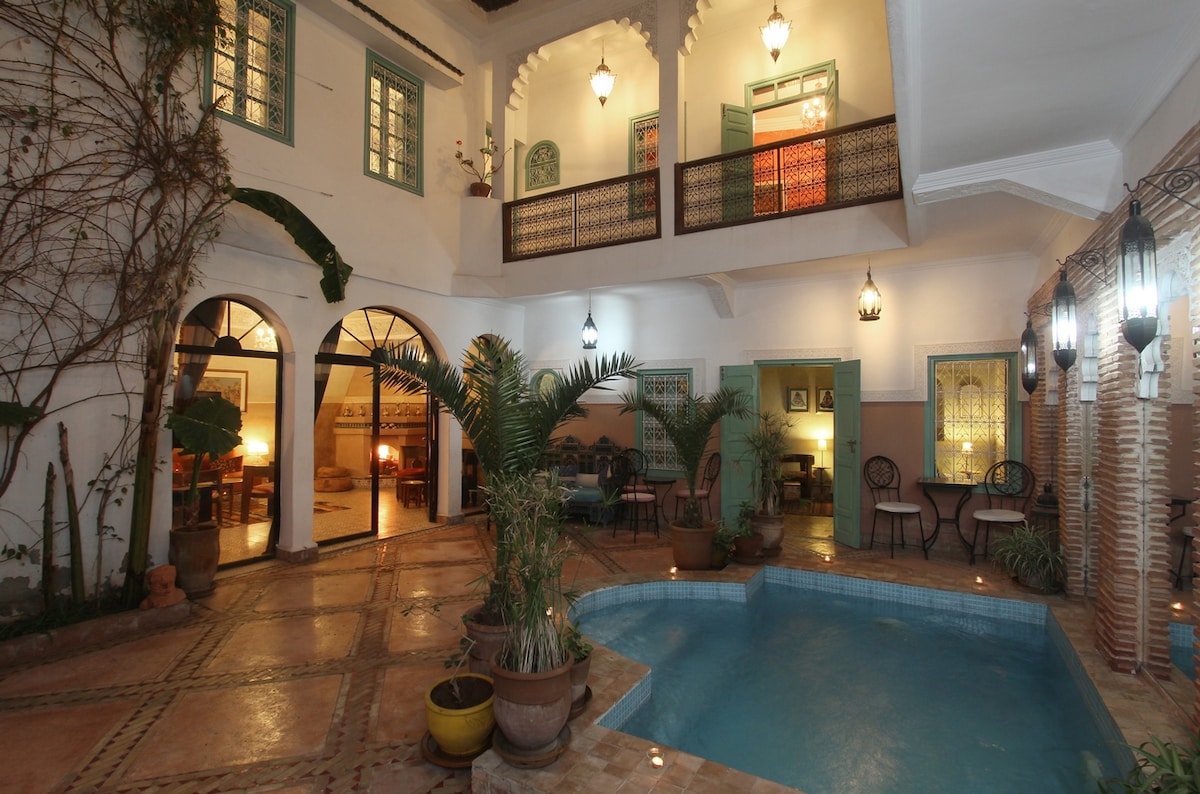 Idéal entre amis ou famille, exclusivement pour vous, centre médina de Marrakech, à coté de la Place aux Epices et 10 minutes de la place Jeema El Fna Le riad vous reçoit dans ses 5 chambres pouvant accueillir jusqu'à 9 personnes Chaque chambre dispose d'une SdB individuelle et d'une climatisation réversible Piscine chauffée dans le patio, terrasse solarium, salon TV & salle à manger sont à votre entière disposition Petit déjeuner et ménage sont compris Diners possibles Loca : J2H7+XPC Marrakech