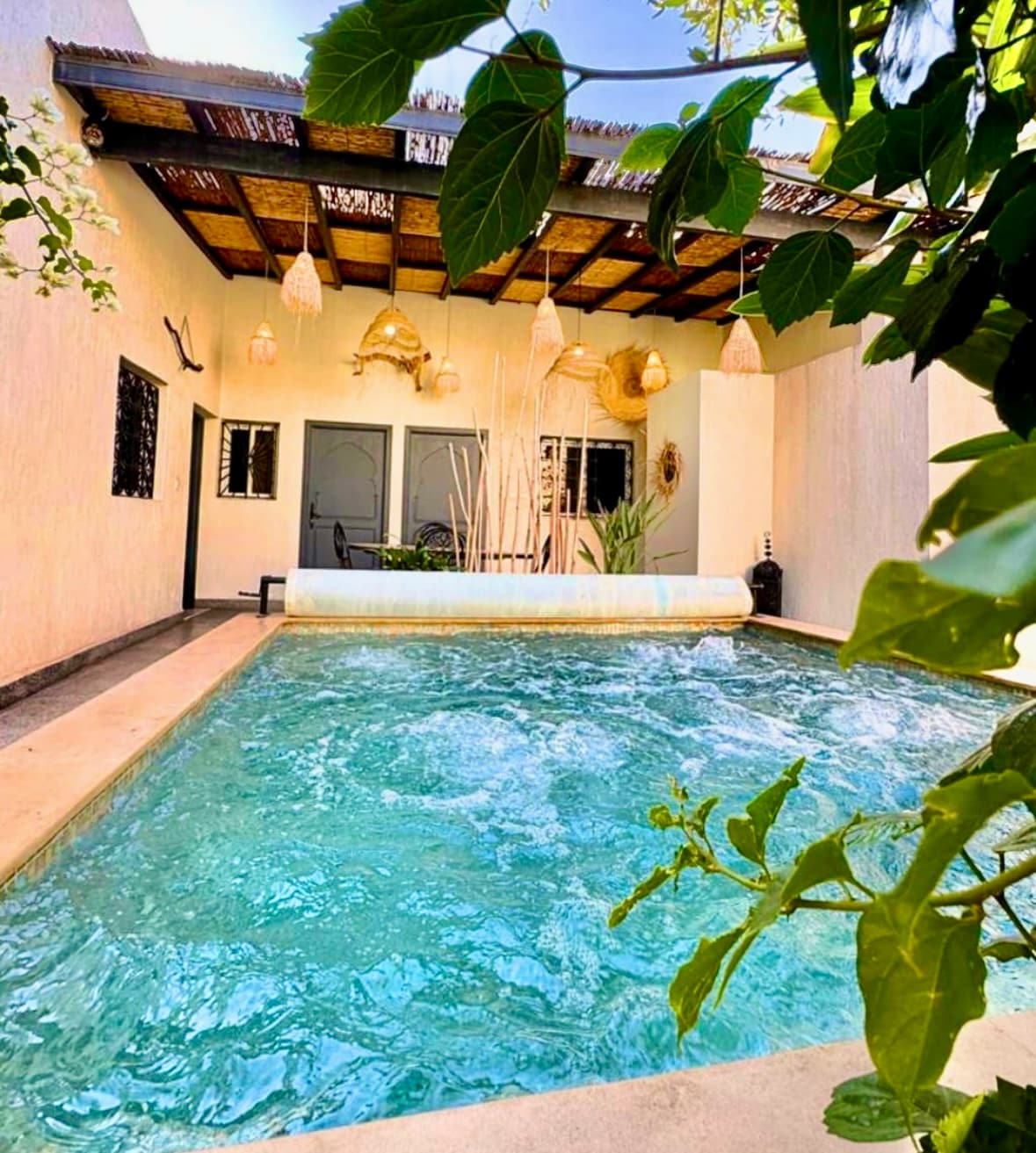 Riad privé à Marrakech pouvant accueillir jusqu’à 8 personnes, avec 3 chambres confortables, chacune avec salle de bain privée, 3 salons traditionnels marocains, un patio lumineux et paisible, une terrasse ensoleillée parfaite pour se détendre, ainsi qu’un bassin entouré d’arbres. Situé à seulement 2 minutes à pied du Mall Almazar, proche des meilleurs restaurants, et à 6 minutes en voiture de la célèbre Place Jemaa El-Fna et 8 minutes de l’aéroport. Calme, confort et authenticité garantis