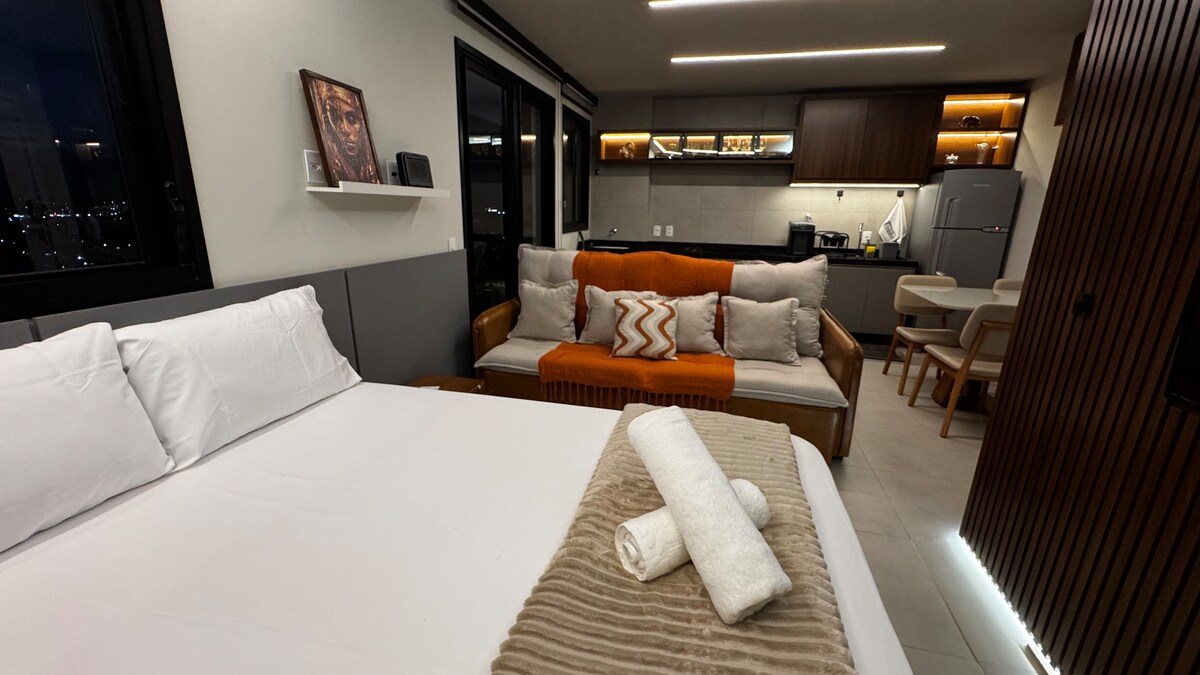 Curta uma experiência elegante neste lugar bem-localizado. Que tem toda a comodidade pra você descansar. Um apartamento novinho em um prédio novo. No quarto você vai ter disponível uma cama queen Próximo a restaurantes, barzinhos. Supermercado, padaria, confeitaria, clínicas. Do melhor comércio de rua onde você vai encontrar as franquias de marcas famosas. Enfim você estará no centro de tudo.