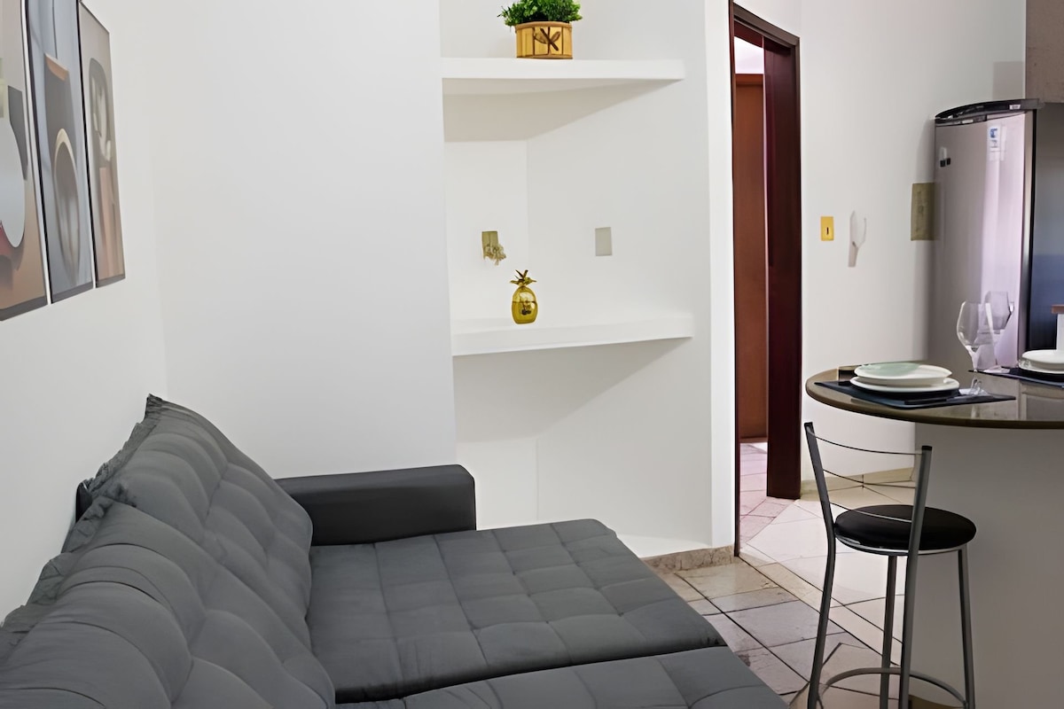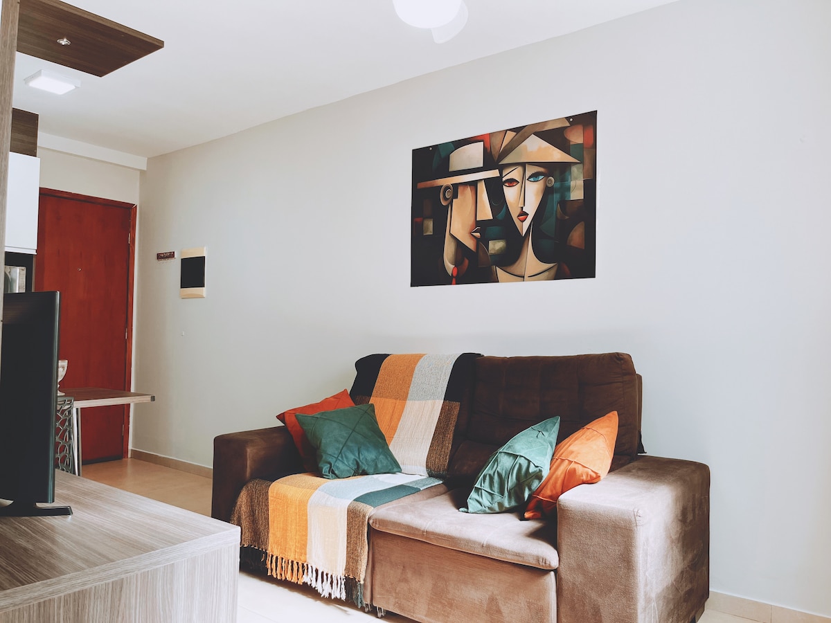 Curta uma experiência elegante neste lugar bem-localizado. Que tem toda a comodidade pra você descansar. Um apartamento novinho em um prédio novo. No quarto você vai ter disponível uma cama queen Próximo a restaurantes, barzinhos. Supermercado, padaria, confeitaria, clínicas. Do melhor comércio de rua onde você vai encontrar as franquias de marcas famosas. Enfim você estará no centro de tudo.
