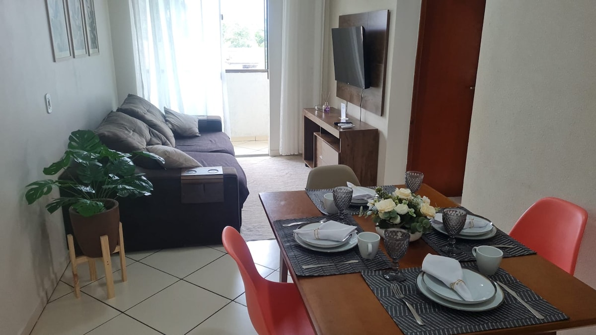 Apto localizado a 300 mt do shopping, 200 mt da rodoviária, na esquina tem um mercado grande. Ambiente tranquilo com ar condicionado em todos os ambientes, churrasqueira privativa, duas vagas de garagem e piscina compartilhada.