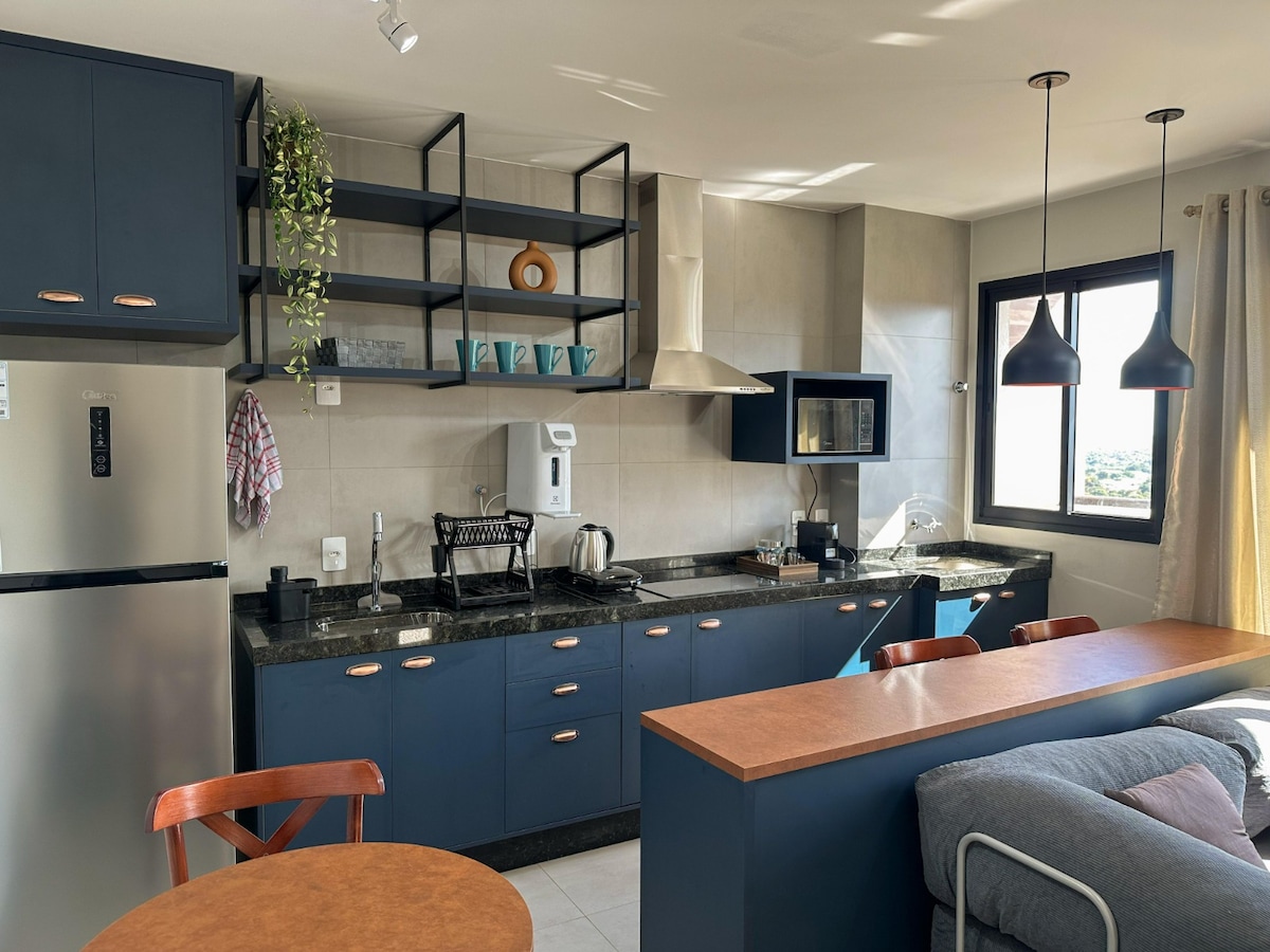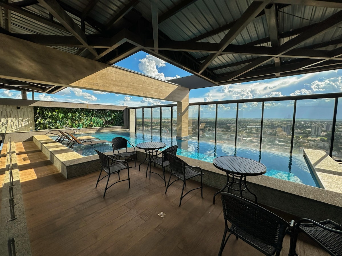 Moderno apartamento em Dourados com uma vista deslumbrante, bem no Centro, ao lado de bares com música ao vivo, farmacias, mercados, para até 3 pessoas. No condomínio contamos com piscina aquecida com borda infinita, sauna, academia, coworking (com reserva antecipada), garagem demarcada e portaria 24h Temos uma cama tamanho casal no quarto, 1 sofa cama na sala, ar condicionado, TV smart, secador de cabelo, Wi-Fi, cozinha completa com cooktop, cafeteira, micro-ondas, jarra elétrica