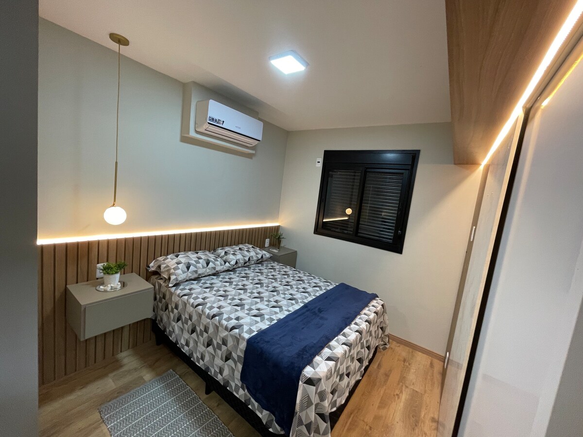 Curta sua estadia neste moderno apartamento com tudo o que você precisa. Contamos com ar condicionado nos quartos, uma sala preparada para te proporcionar um momento de descanso com televisão smart Android para que você possa assistir seus programas favoritos! Nossa cozinha contém todos os eletrodomésticos que você precisa para fazer uma comidinha deliciosa! Mas se não quiser cozinhar, não se preocupe, há vários restaurantes próximos! Lavanderia também está completa para o seu uso, aproveite!