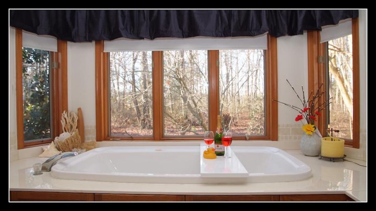 This mother-in-law suite is romantic and luxurious, in beautiful surroundings. Nestled in the woods you will enjoy peace and quiet. This romantic hideaway has separate parking, walkway, patio & entrance. You also have a 2-person jacuzzi tub, fire pit, and BBQ grill. Country roads are safe for walking, biking, jogging. Day trip to Atlantic beaches (19+mi.), Dover (24mi.), DC, and Philly (2 hrs each)