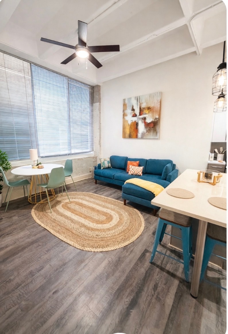 Welcome to your Castleberry Hill loft - a character-filled downtown stay with flexible space and easy access to Atlanta’s top spots. - Sleeps 6 | 2 bedrooms | 3 beds | 1.5 baths - Elevator access & free parking garage on premises - 1 space - Rooftop lounge, shared patio or balcony & shared BBQ grill: electric - Full kitchen w/ Jenn-Air stainless steel gas stove - In-unit washer & dryer, dedicated workspace - Self check-in w/ smart lock & long term stays allowed