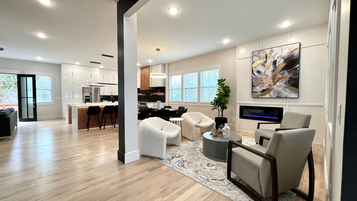 Make your trip to Atlanta unforgettable when staying at Camilla Haus, a 2023 luxurious modern built. Our home is a sophisticated new construction with high end finishes featuring 10 ft ceiling, open floor plan, a grand chef kitchen, double island with high end wood slat accent, designers bathrooms, large master suite with a double shower, pendant lights over nightstands, largeTVs in each room, LED lights throughout and more…
