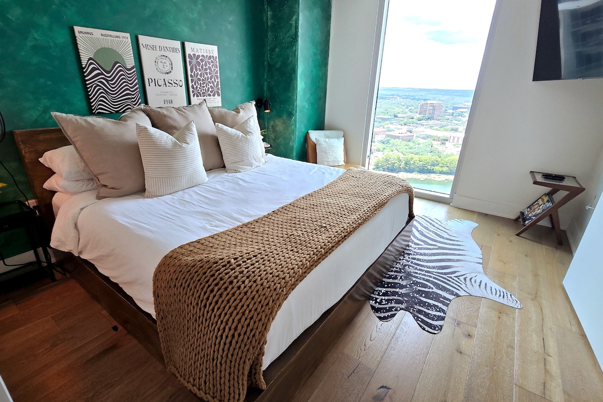 Experience luxury and style at our stunning condo high atop downtown Austin, where subtle chic Greek Island vibes meet modern Austin living with 2 bedrooms, 2 bathrooms, and a sleek design adorned with art and pottery. You’ll enjoy the building’s 33rd floor amenity level with breathtaking city views from the one of a kind rooftop pool, cozying up by the fire pit or fire place, or mingling in the clubhouse.