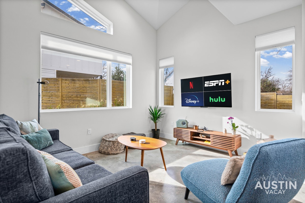 Discover your modern Austin retreat! This brand-new home comfortably sleeps 7 and features a private backyard completely fenced. Enjoy a stylish open-plan living area, a fully equipped kitchen, and a dedicated workspace. Centrally located just minutes from Downtown and The Domain, it's the perfect launchpad for your city adventures. Relax in style and comfort in this designer home.