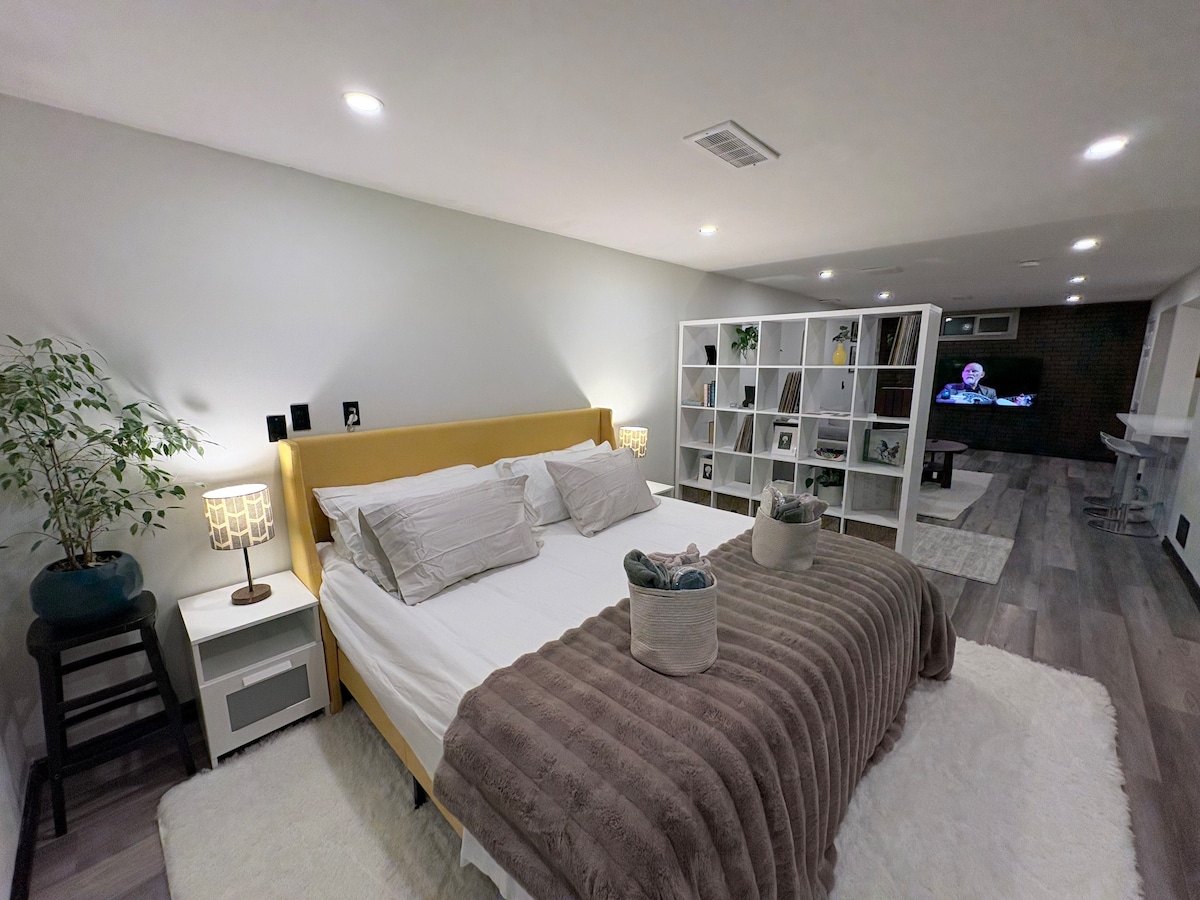 Welcome to this cozy and private basement suite in the heart of Calgary. Walking distance to Market Mall, University District, cafés, and great local restaurants. Perfect for couples, solo travelers, or business stays. Enjoy a comfortable king bed, fast WiFi, dedicated workspace, TV, microwave, coffee maker, sofa bed, and a full private shower. A quiet, welcoming space close to Market mall, University of Calgary, and Children's Hospital.